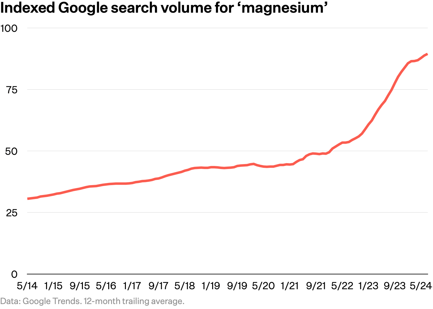 Interest in magnesium, a mineral, has grown dramatically over the past several years, usually associated with relaxation, sleep, and other mood-related uses. “If you look up any nutrient or mineral,” Preysman tells me, “magnesium is the most-searched on Google. Above everything.”