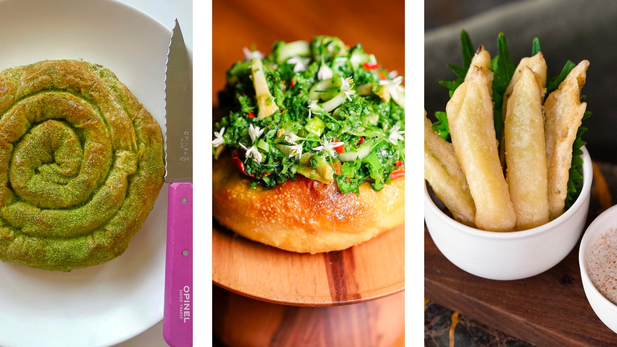 Kismet then put a Sweet Garleek borek bread (pictured below left) on its menu for a month. Another LA restaurant, Yangban Society, offered a totally different Sweet Garleek bread (center). In Portland, Ox partnered with Row 7 to “enhance some of our favorite dishes” with Sweet Garleek, including a wood-fired halibut dish and another with mushrooms, spinach, and soy-cured duck yolk.