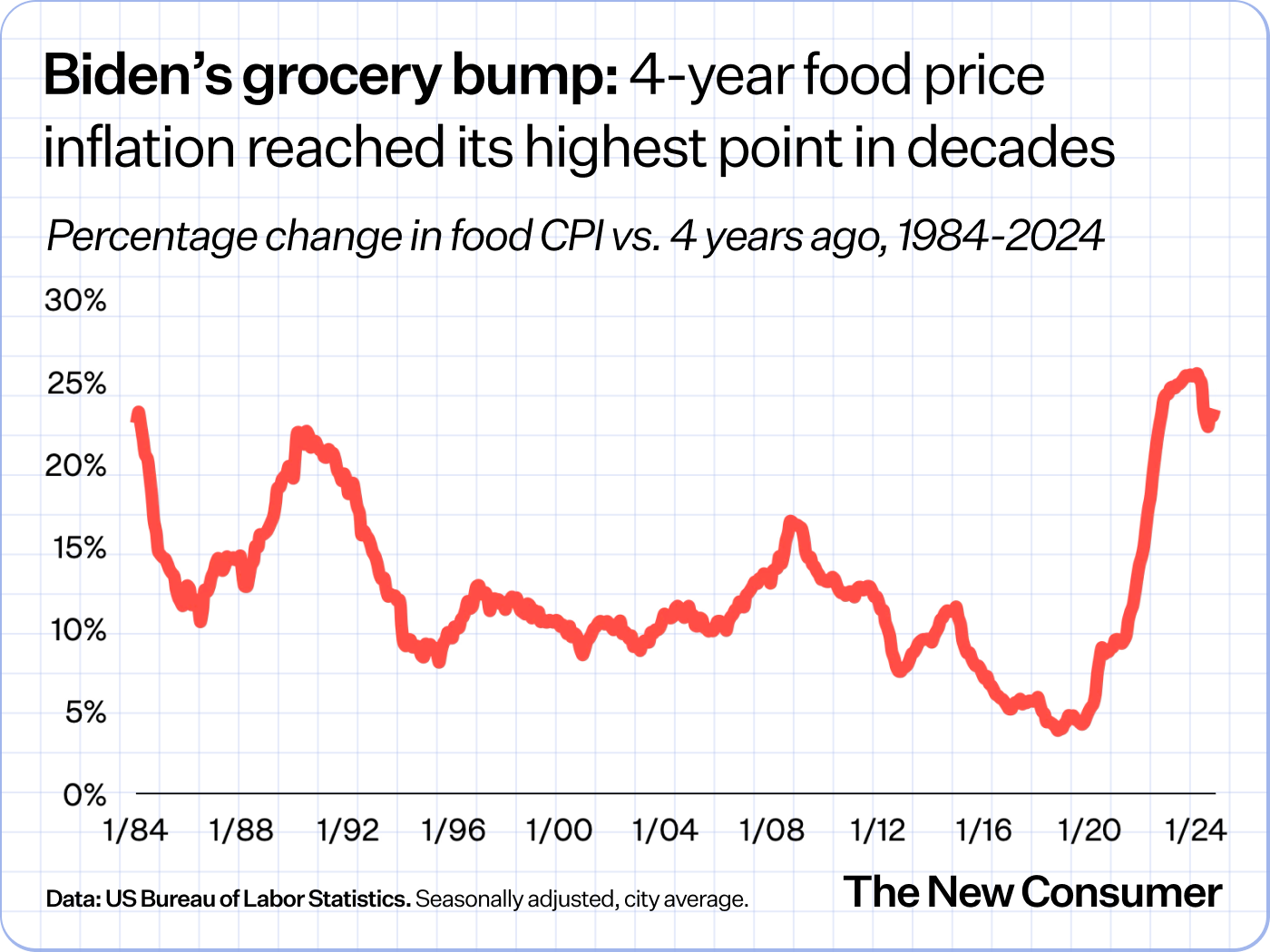 Here’s a 40-year chart showing the moving line of 4-year food inflation in the US — the length of a presidency term.