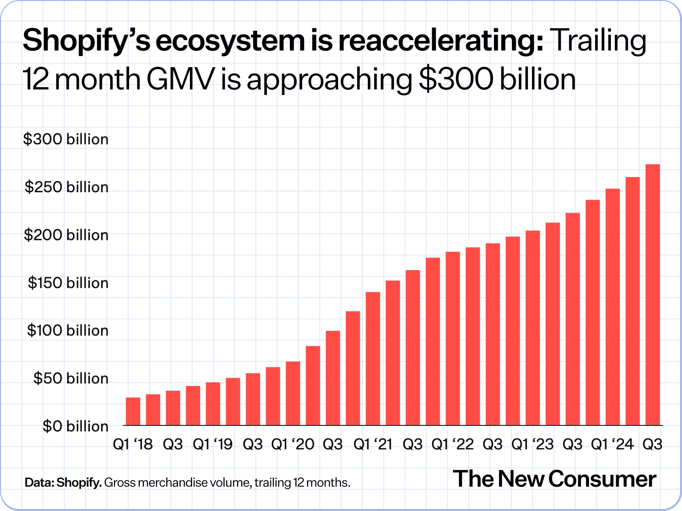 It also shows continued acceleration: Shopify’s gross merchandise volume (GMV) hadn’t grown that rapidly in a quarter since the end of 2021. It has now grown almost 5x in 5 years, and more than 10x since the fall of 2017. Approaching $300 billion, it’s more than a third of the size of Amazon’s GMV, which TD Cowen estimates will reach $772 billion this year.