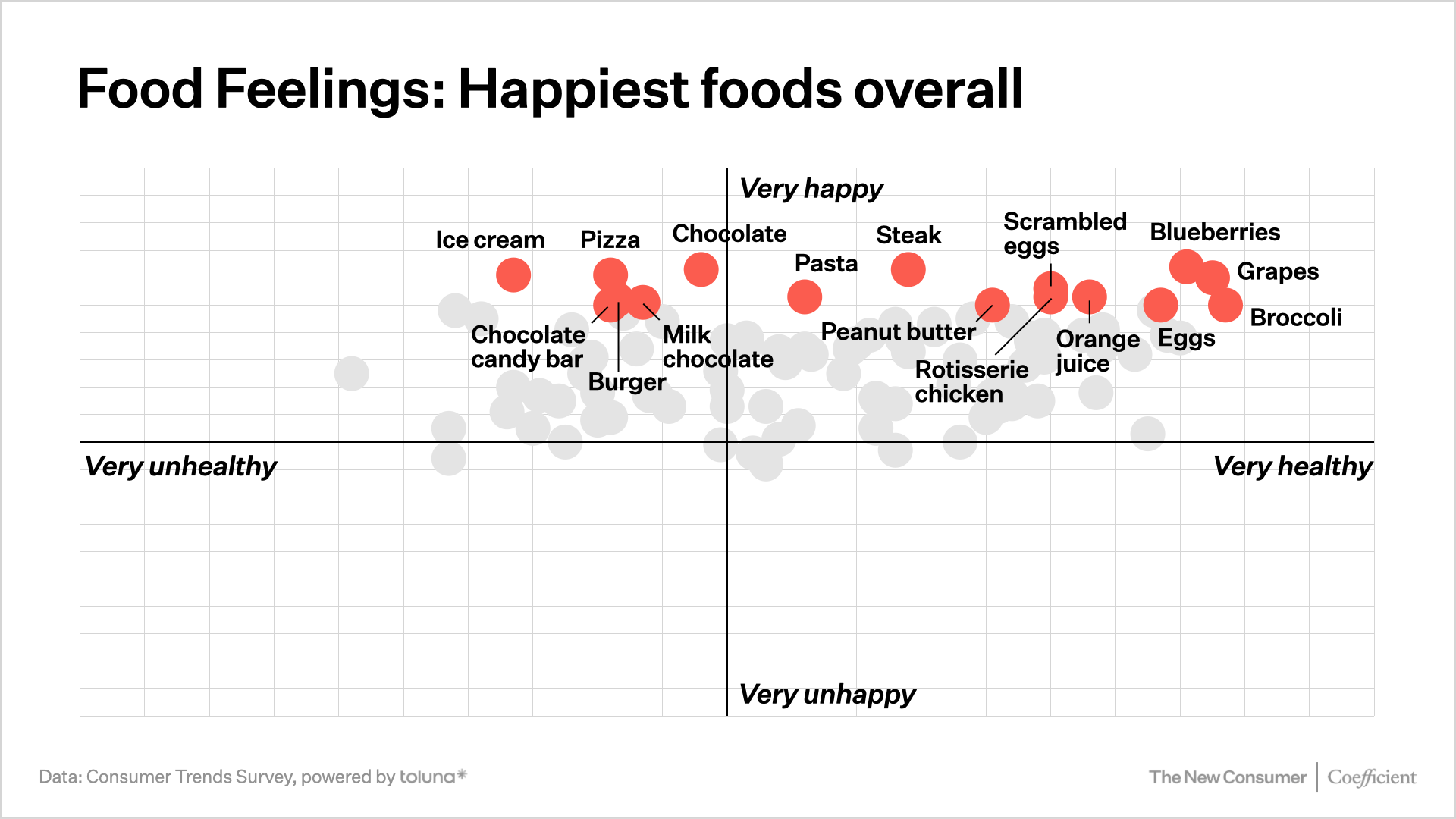 Here’s the wide view — 96 food and beverage items plotted on two axes, ranging from “very unhealthy” to “very healthy” and “very unhappy” to “very happy.” We’re calling it the Consumer Trends Food Feelings Matrix.