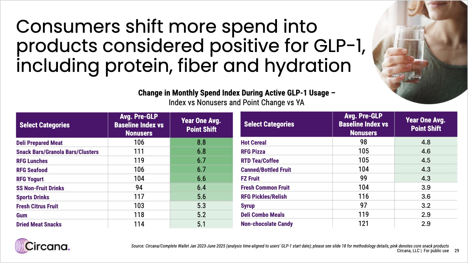 The top-gaining categories among active GLP-1 users, as tracked by Circana, include prepared deli meats; snack bars and granola; refrigerated lunches, seafood, and yogurt; beverages, including sports drinks; fresh citrus; gum; and dried meat snacks.