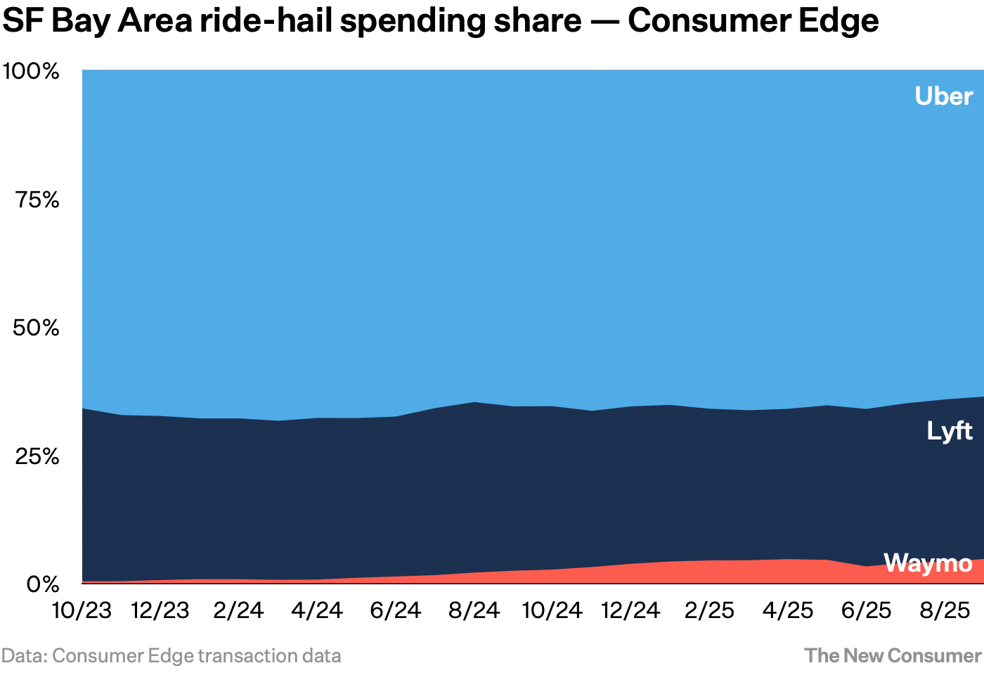 In the Bay Area, Waymo represents about 5% of consumer spending among the rideshare trio of Uber, Lyft, and Waymo, according to Consumer Edge, which tracks credit and debit card spending data.
