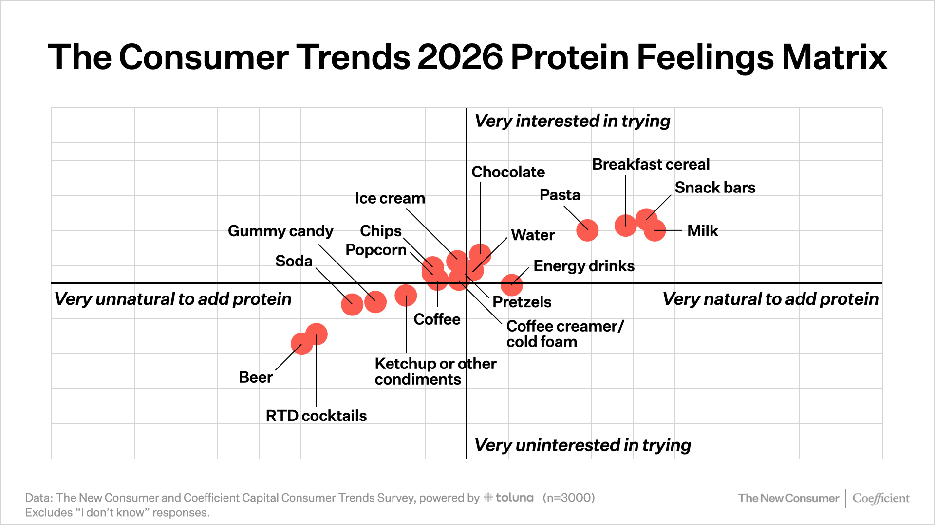 The obvious winners are obvious: There are some products — pasta, cereal, snack bars, and milk — where people, on average, think adding protein makes a lot of sense and are interested in trying high-protein versions. Many of these are established, mature categories for high-protein offerings, and should continue to be successful.