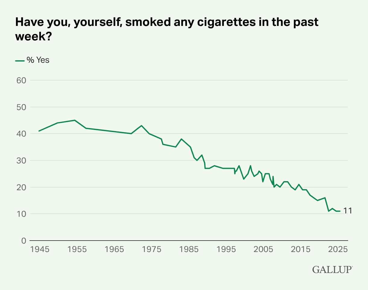 In mid-2025, 11% of Americans said they had smoked a cigarette in the past week, tied for the lowest percentage ever, and down by nearly half from a decade ago, according to Gallup, which has been conducting this survey for more than 80 years. That percentage has been in decline since the 1950s. And while it moves a little year to year, the overall trendline is that fewer people are smoking, not more.