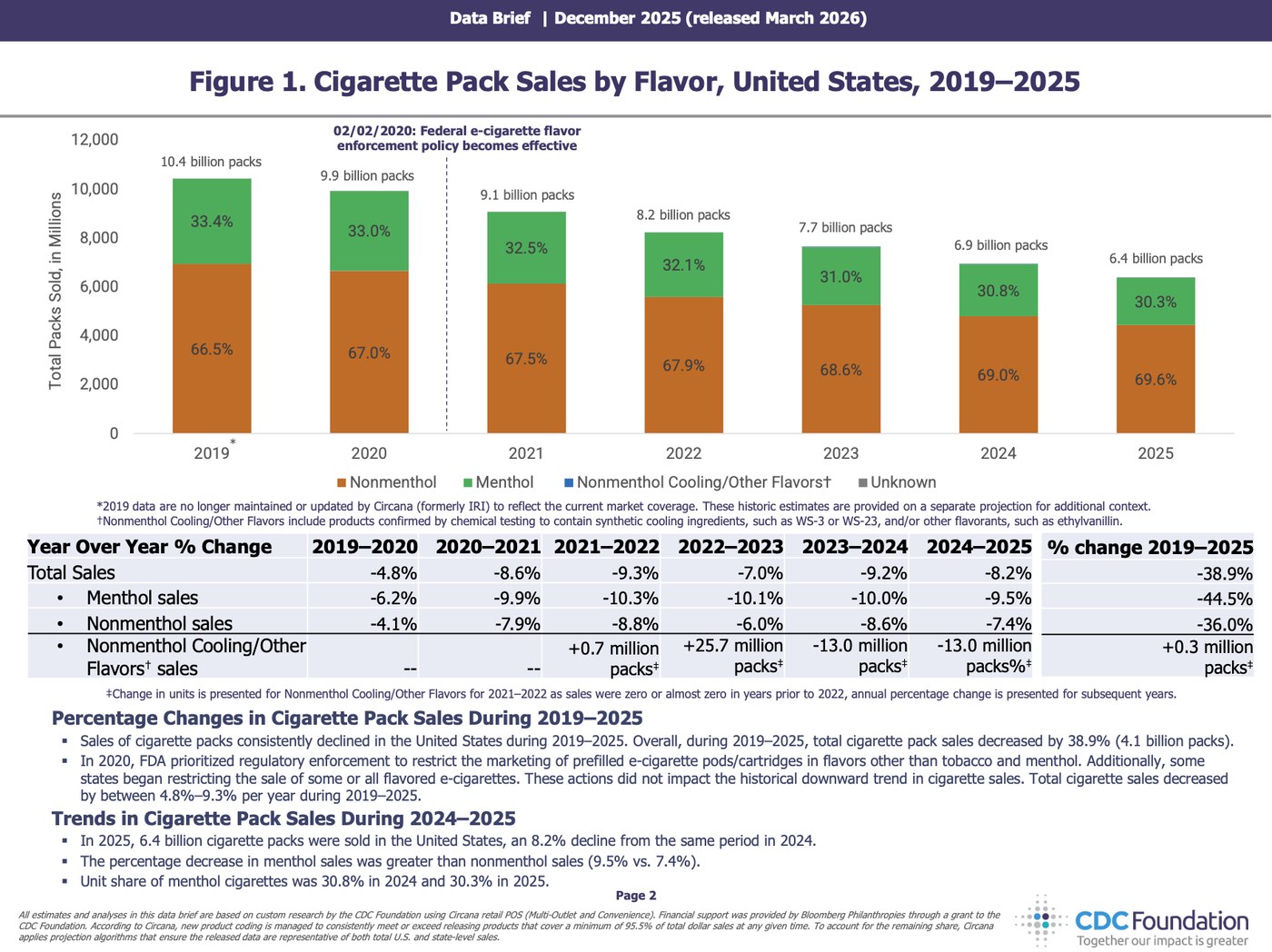 Cigarette sales fell to 6.4 billion packs in the US last year, down 8% year over year from 6.9 billion packs in 2024 and down 39% from 10.4 billion packs in 2019. Cigarette pack sales declined 10% year over year in California and 7% in New York in 2025, according to the report.