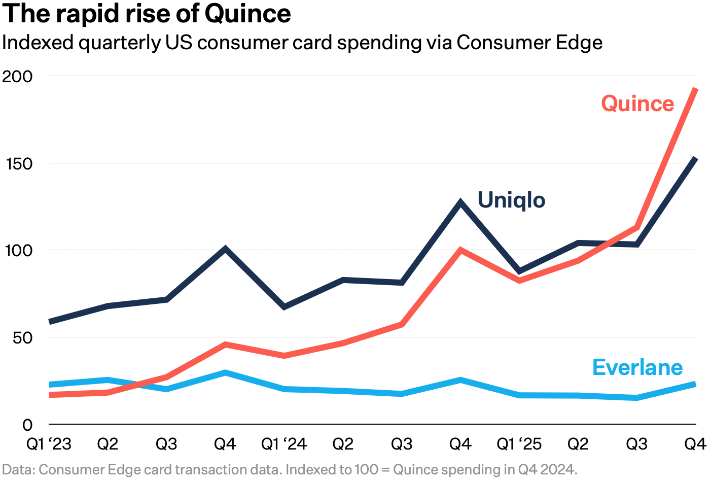 Quince grew rapidly last year, roughly doubling, according to US consumer credit and debit card transaction data provided by Consumer Edge. In the fourth quarter of last year, growth accelerated and it even overtook Uniqlo. And it has long zipped past Everlane, one of our favorite elevated-basics concepts from the early DTC era.