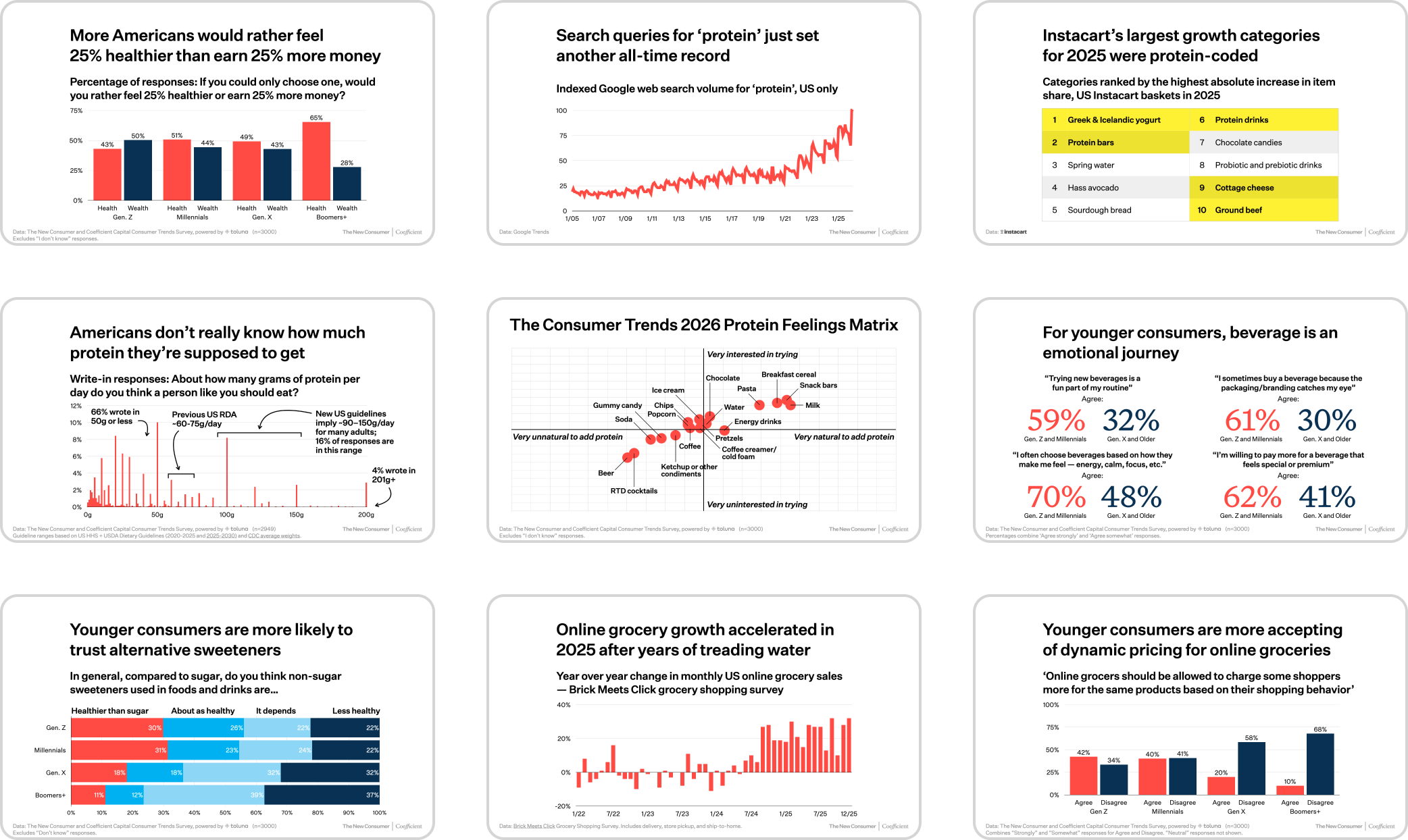 - Topics include: The protein boom, the future of beverages, and the next growth inflection for online grocery. Also: A third of Americans consider themselves in “optimization mode” to live better, not just longer.